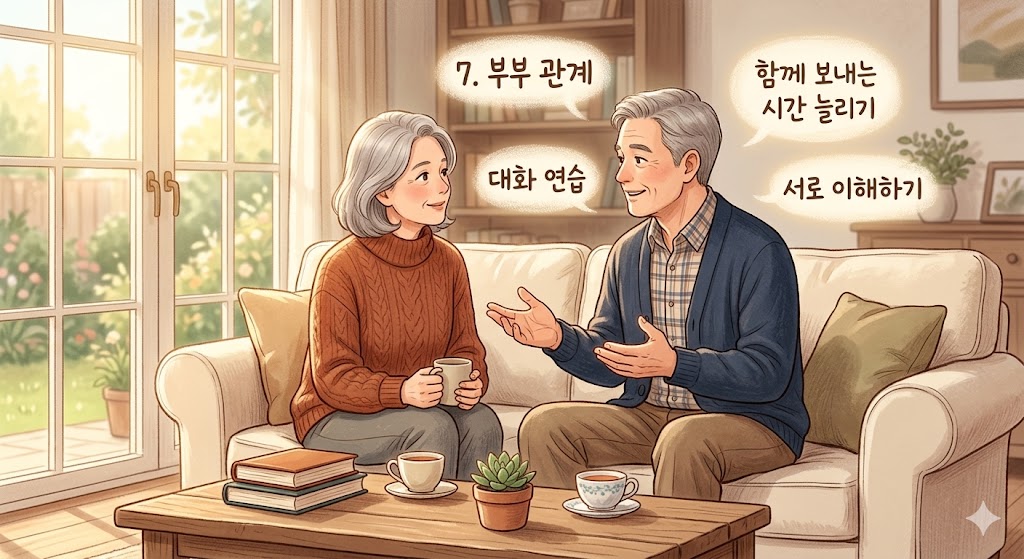 은퇴 후 가장 흔히 겪는 실수가 모든 시간을 함께하려고 애쓰는 것입니다. 하지만 건강한 부부 관계는 서로의 독립된 공간과 시간을 존중해 줄 때 유지됩니다. 50대부터는 각자의 취미 생활을 존중하면서도, 동시에 함께 즐길 수 있는 '공통의 분모'를 만들어가는 연습이 필요합니다.