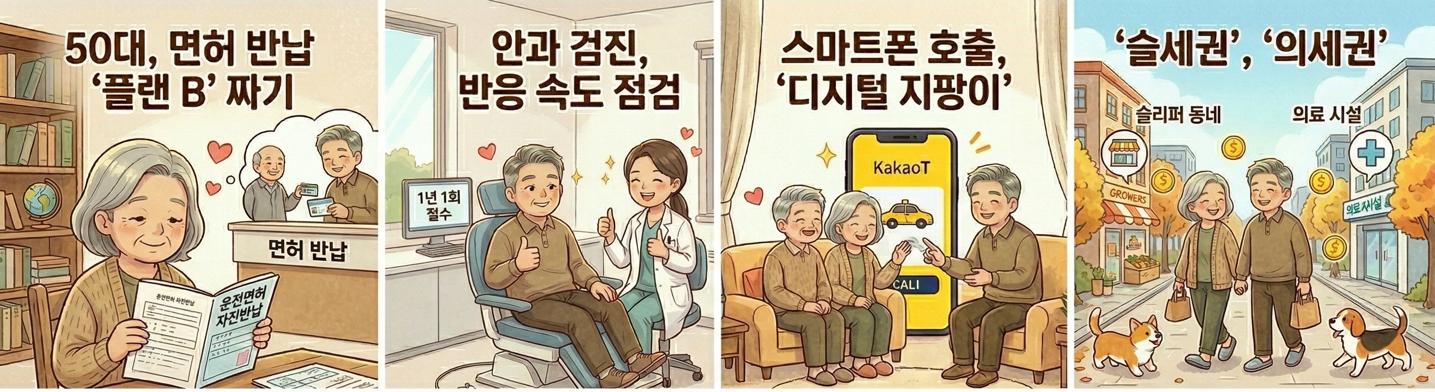 나만의 은퇴 기준 정하기: "야간 운전이 힘들어질 때", "주변 경적 소리가 잘 안 들릴 때" 등 스스로 운전대를 놓을 기준을 미리 정해두면 나중에 덜 비참합니다.