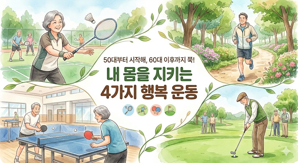 50대부터 준비하는 운동은 '누구보다 잘하는 것'보다 '오래 하는 것'이 핵심입니다. 배드민턴과 탁구로 순발력과 뇌 건강을 지키고, 러닝과 파크골프로 하체 힘과 기초 체력을 다진다면 활기찬 제2의 인생을 즐길 수 있습니다. 경제적인 부담 없이, 지금 당장 시작할 수 있습니다. 100세 시대의 건강 설계, 오늘 바로 가까운 공원이나 주민센터를 방문해 보는 건 어떨까요? 여러분의 건강한 도전을 진심으로 응원합니다.